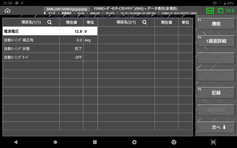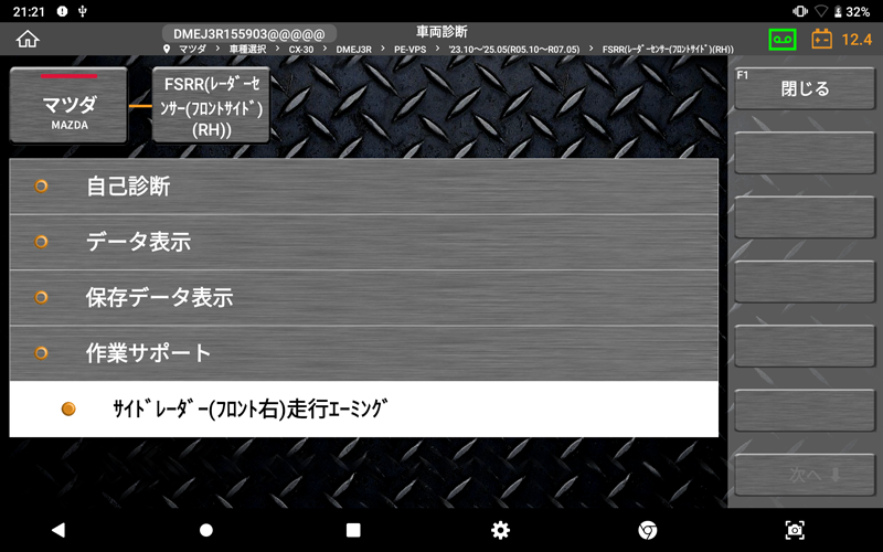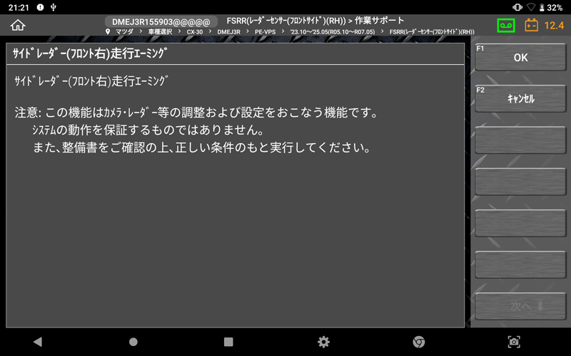CX-30等に搭載されているフロントサイドレーダー(FSRL、FSRR)システムにおいて、走行エーミングの作業サポートに対応しました。